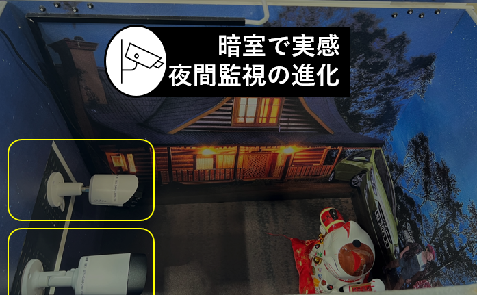 今回、本シリーズをお客様の夜間の防犯対策に活用可能かを確認できるよう、ブース内に従来機種とWizColorカメラを入れた小型暗室をご用意しました。